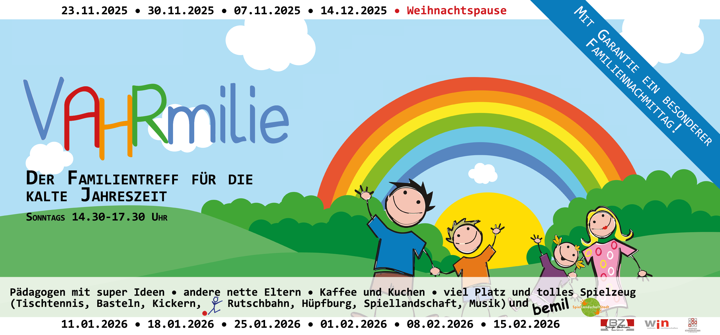 Für einen Spielplatzbesuch ist das Wetter um diese Jahreszeit eher suboptimal: Es ist kalt, nass, ungemütlich. Was also tun an einem Sonntagnachmittag? Das Bürgerzentrum Neue Vahr hat mit VAHRmilie, dem Sonntagstreff für Familien,´eine Antwort auf diese Frage parat – und sorgt für Abwechslung an solchen Tagen. Der Treff für die ganze Familie im Bürgerzentrum Neue Vahr startet am Sonntag, den 23. November 2025, in die neue Saison, nach einer kurzen Weihnachtspause geht es vom 11.01.2026 bis zum 15.02.2026 weiter.