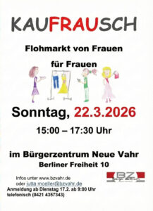 Infos für Verkäufer:innen: Anmeldung am 17.02.2026 ab 9:00 Uhr persönlich bei Jutta Möller, per Mail jutta.moeller@bzvahr.de oder flohmarkt@bzvahr.de – keine telefonische Anmeldung möglich!!!!